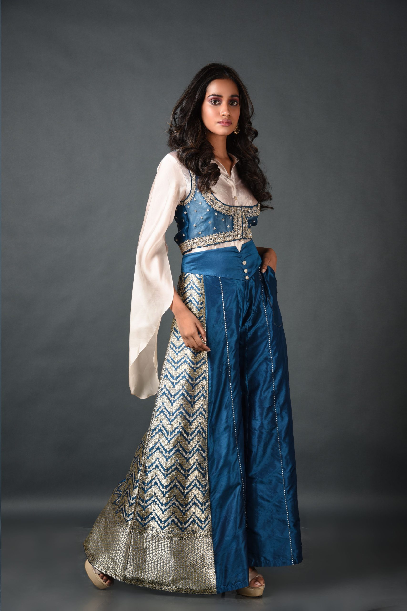 Discover elegance and sustainability with our Royal Blue Brocade Panel Pants from the ‘Woven Vogue’ collection by House of Ksara. Crafted with intricate thread bead work on luxurious brocade fabric, these pants are designed for comfort and style at sangeet events, engagements, and milestone celebrations. Embrace the heritage of Banarasi craftsmanship with every wear, ensuring timeless elegance for the modern woman.