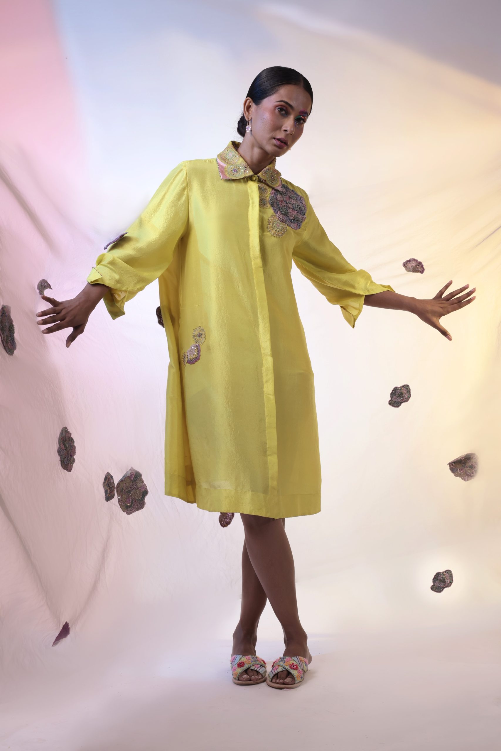 Embrace elegance with the Sunlit Meadow A-Line Dress, meticulously handcrafted from luxurious thick silk. Featuring a double collar, 3/4 inverted cuff sleeves, and intricate thread beadwork, this vibrant yellow dress is perfect for afternoon soirees, formal events, and Rakhi lunches.
