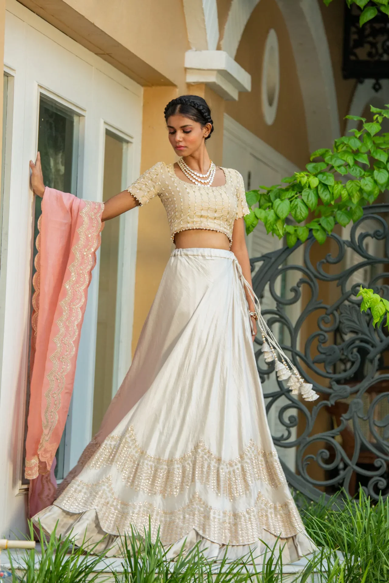 Embrace sophistication with the Enchanted Twilight Umbrella Lehenga from House of Ksara’s “Got-A-Vibe” collection. Crafted from luxurious grey viscose satin and adorned with exquisite Gotta Patti embroidery, this lehenga features an umbrella silhouette that flows gracefully. Perfect for receptions, formal dinners, and sangeet events, it enhances your beauty with a radiant aura, reflecting timeless elegance and luxury.