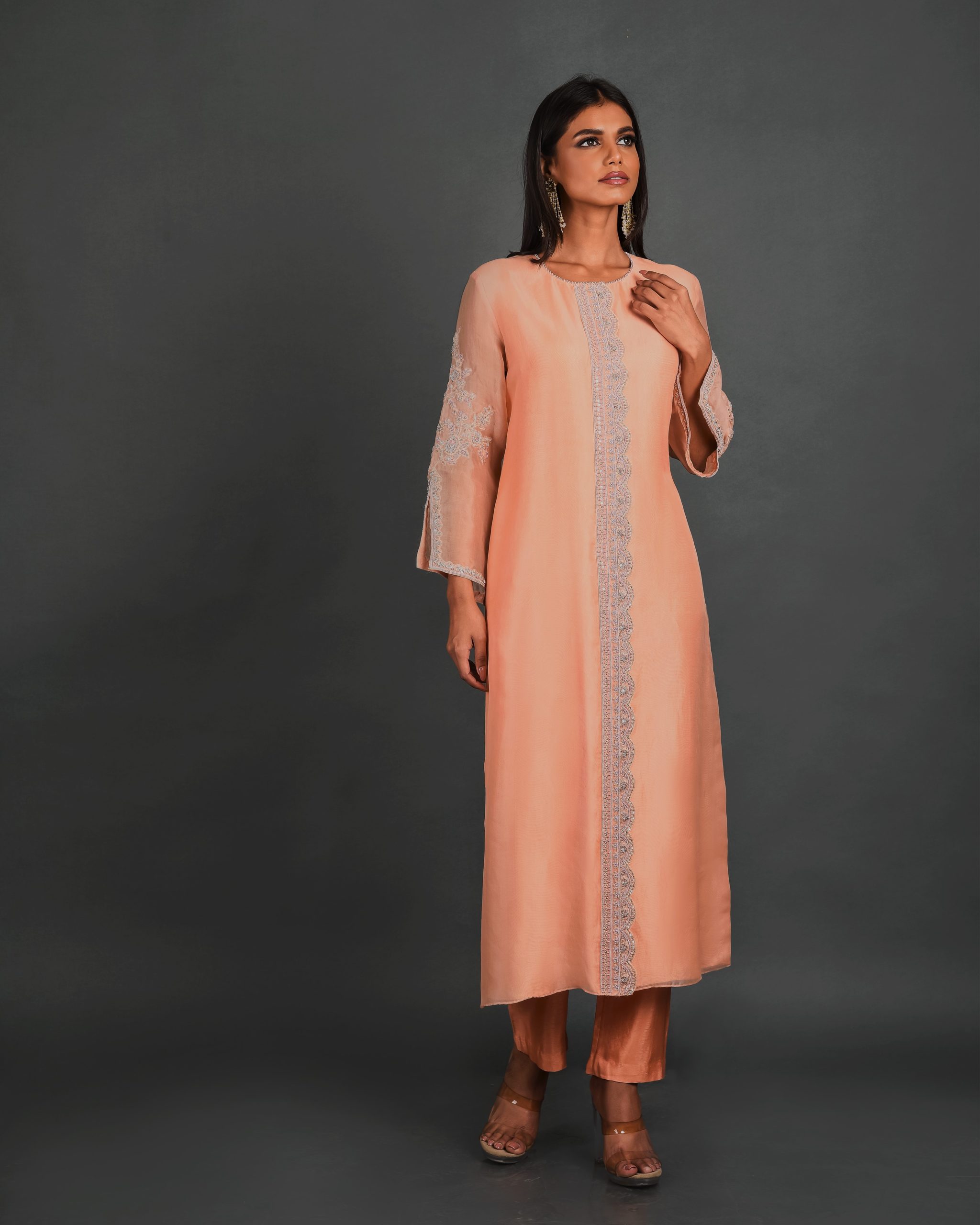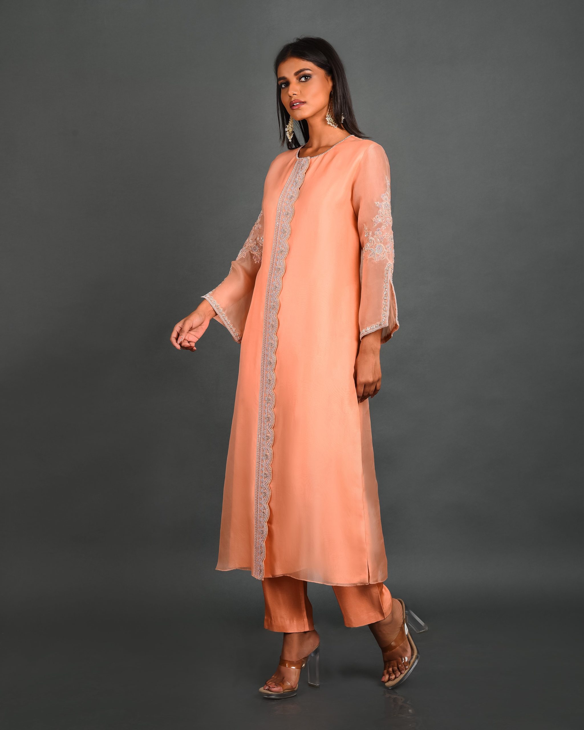 Elevate your occasion wear with the Peach Blossom Jacket Kurta from House of Ksara’s “Shimmering Shrubs” collection. Crafted from peach summer silk – Kora Dupion, this kurta features a round neck, 3/4 slit sleeves, and intricate thread beadwork, perfect for Mehendi parties, Sangeet events, and cocktail parties. Handcrafted luxury that embodies timeless elegance.