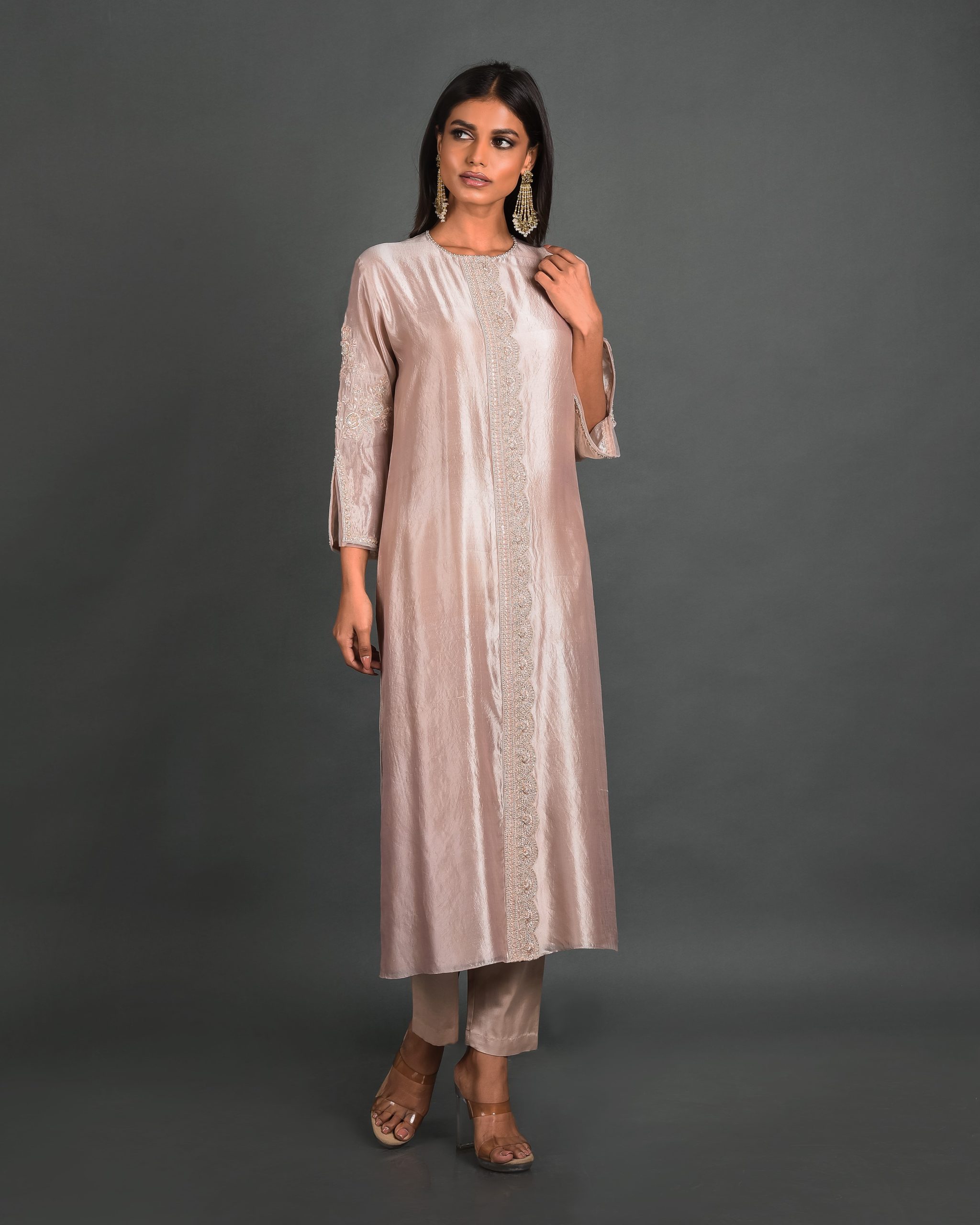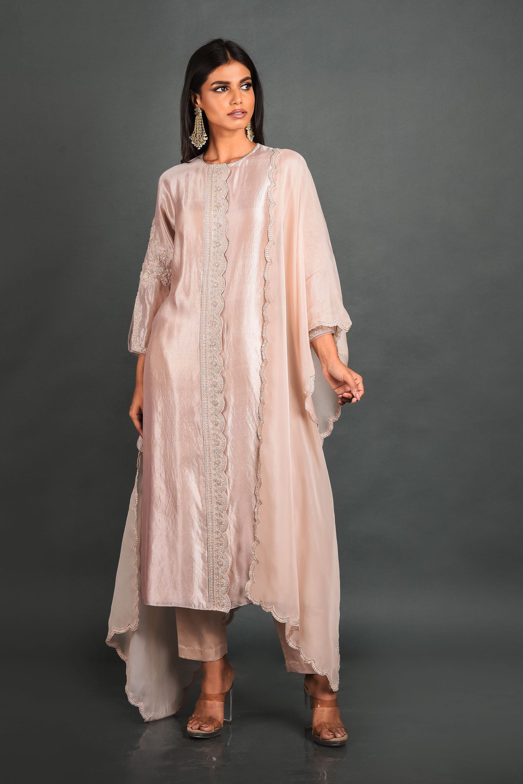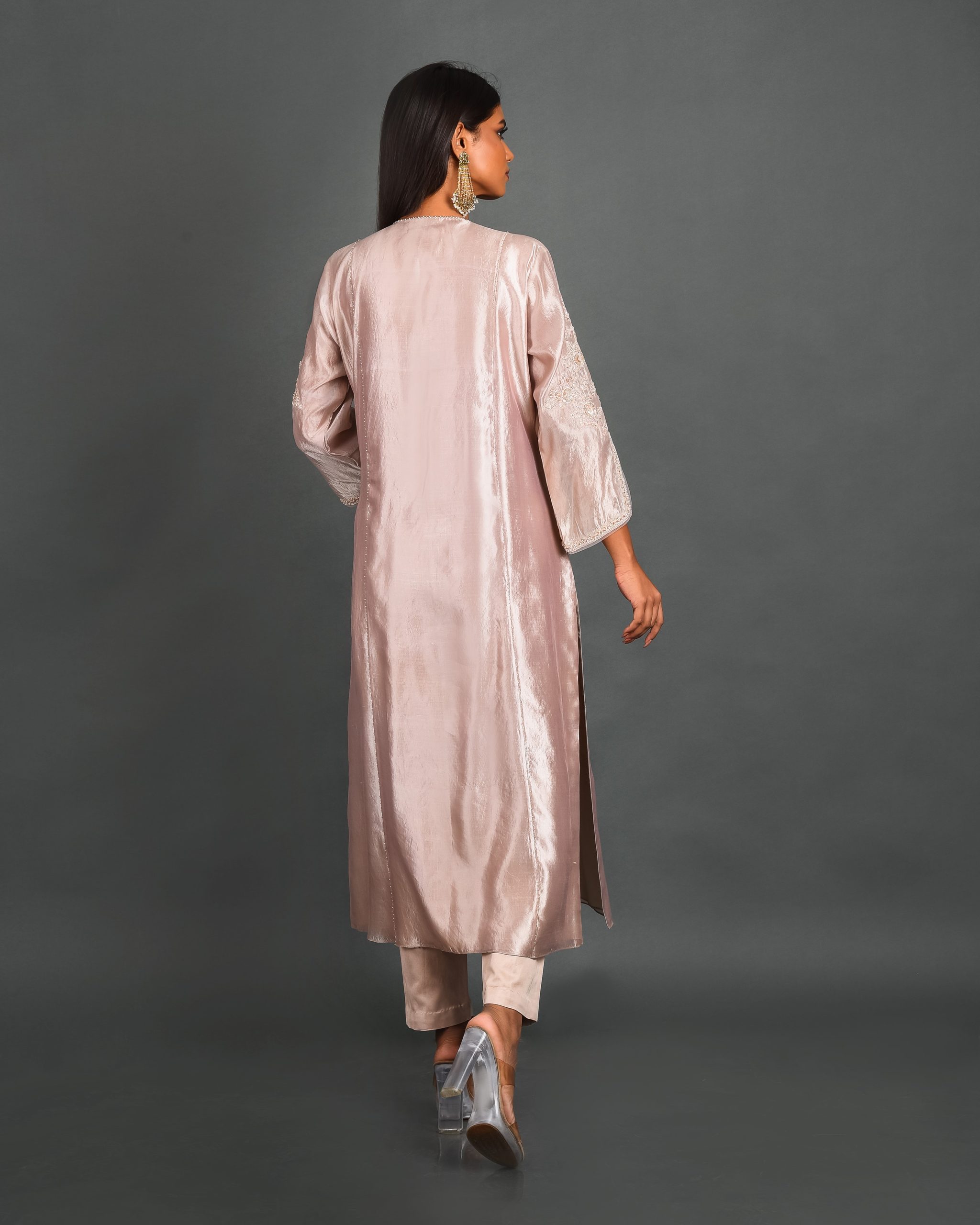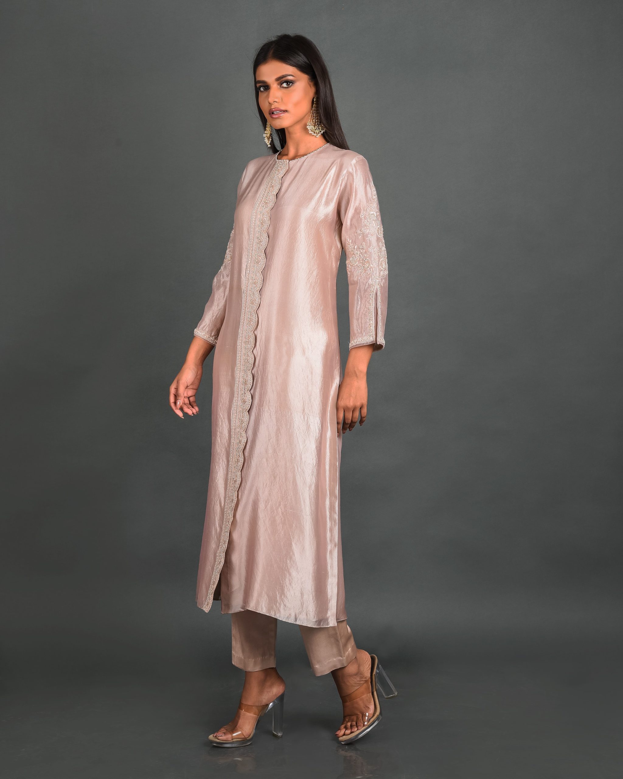 Elevate your occasion wear with the Rosy Dew Jacket Kurta from House of Ksara’s “Shimmering Shrubs” collection. Crafted from pink summer silk – Kora Dupion, this kurta features a round neck, 3/4 slit sleeves, and intricate thread beadwork, perfect for Mehendi parties, Sangeet events, and cocktail parties. Handcrafted luxury that embodies timeless elegance.