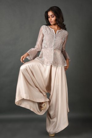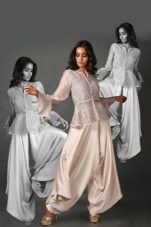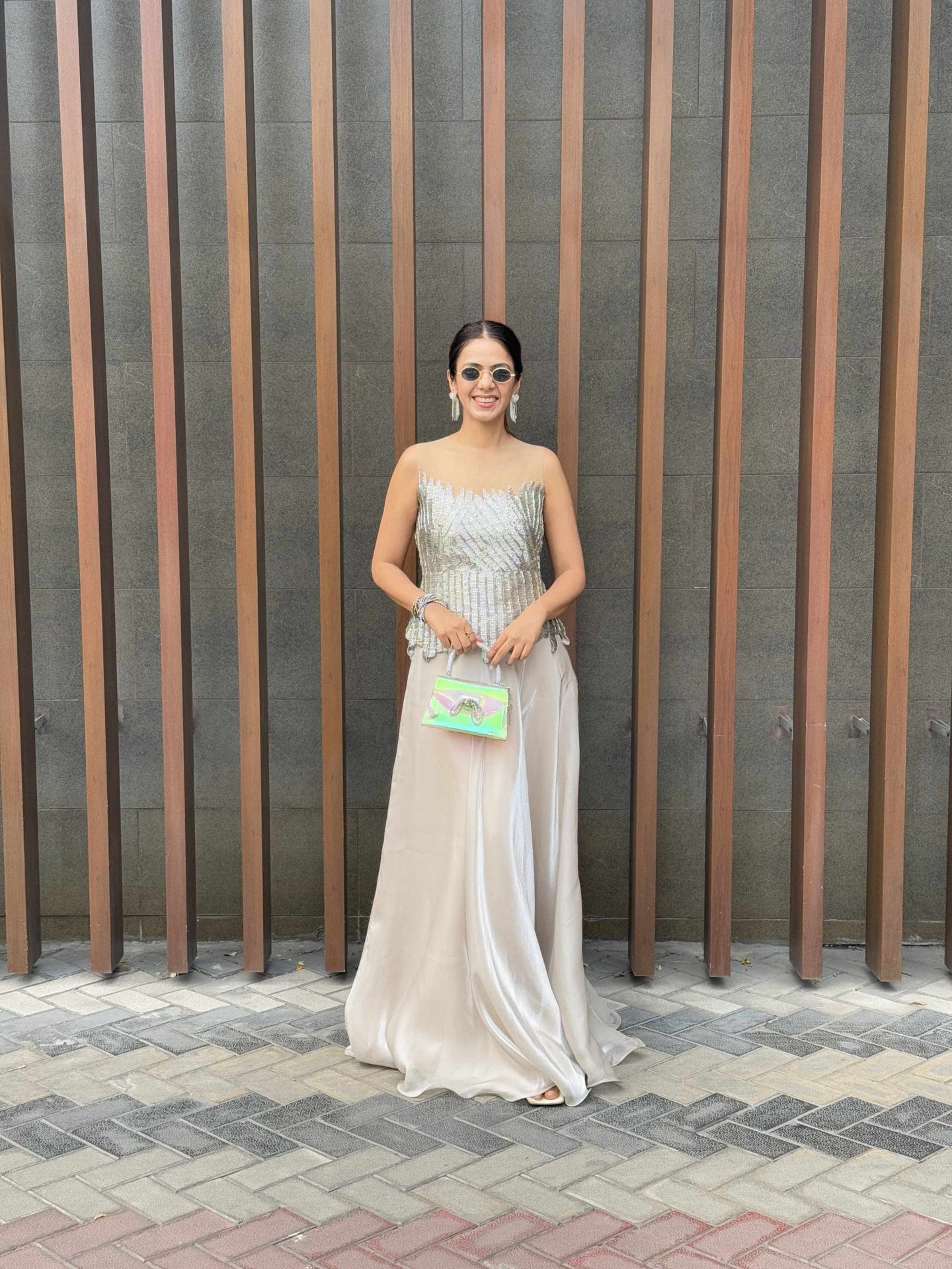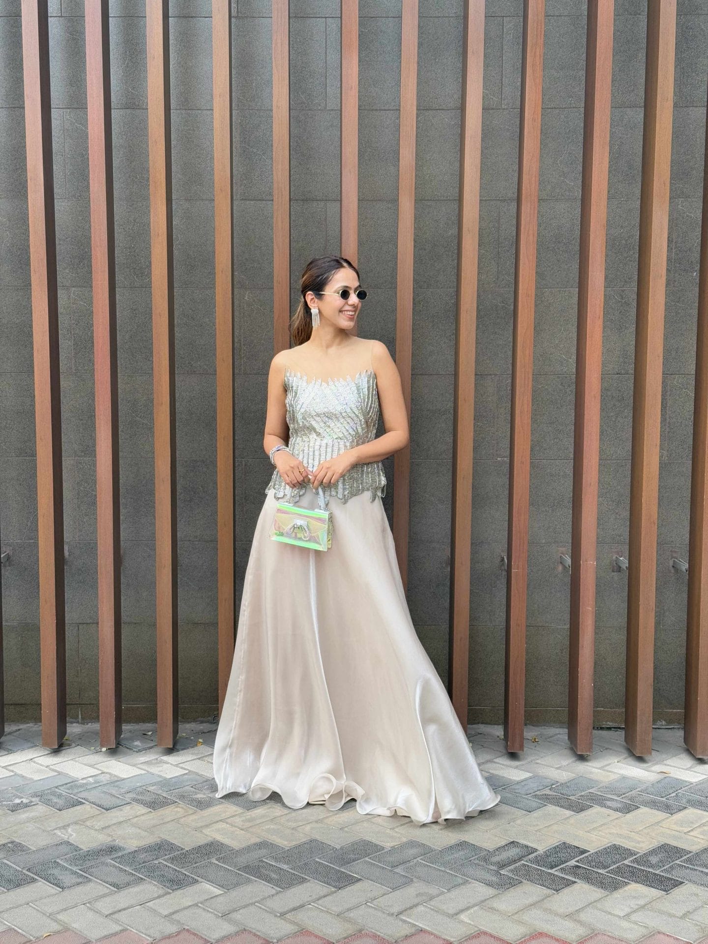 Dazzle in this stunning Silver Katdana Top, adorned with intricate cutdana work, perfectly paired with a Silver Shimmer Skirt. Designed for effortless glamour, this ensemble blends intricate craftsmanship with a radiant, shimmering finish—perfect for making a statement.